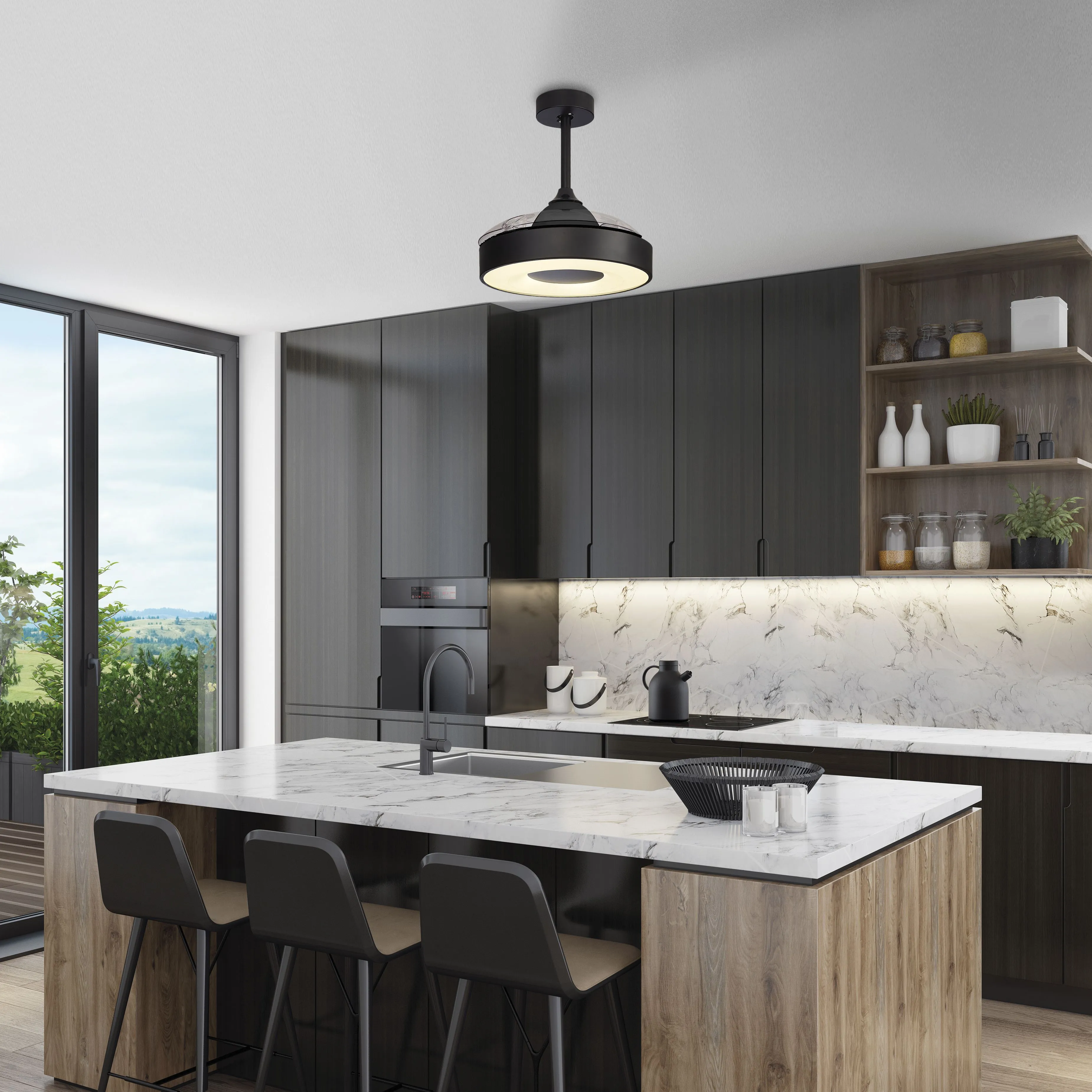 С помощью пульта пользователь может управлять яркостью и цветовой температурой освещения, скоростью вращения вентилятора, а также открывать или закрывать лопасти.