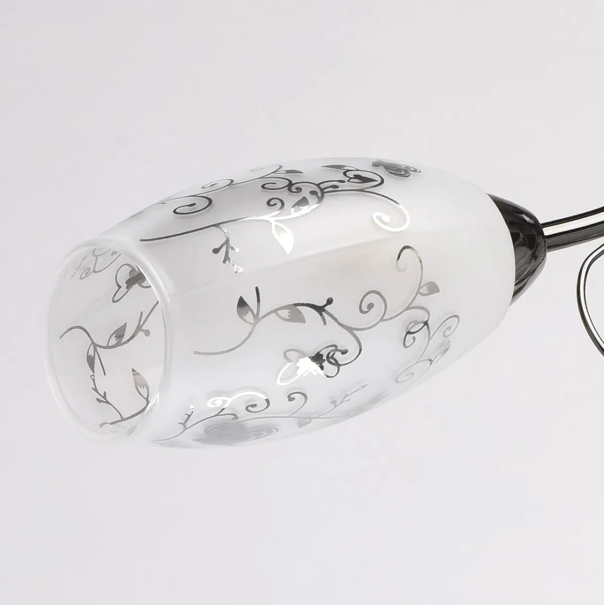 Металлическое основание цвета никеля, плафоны из матового стекла с гальванизированным рисунком, деко