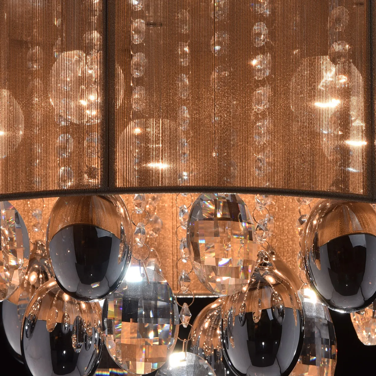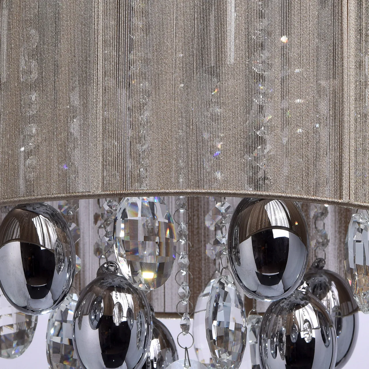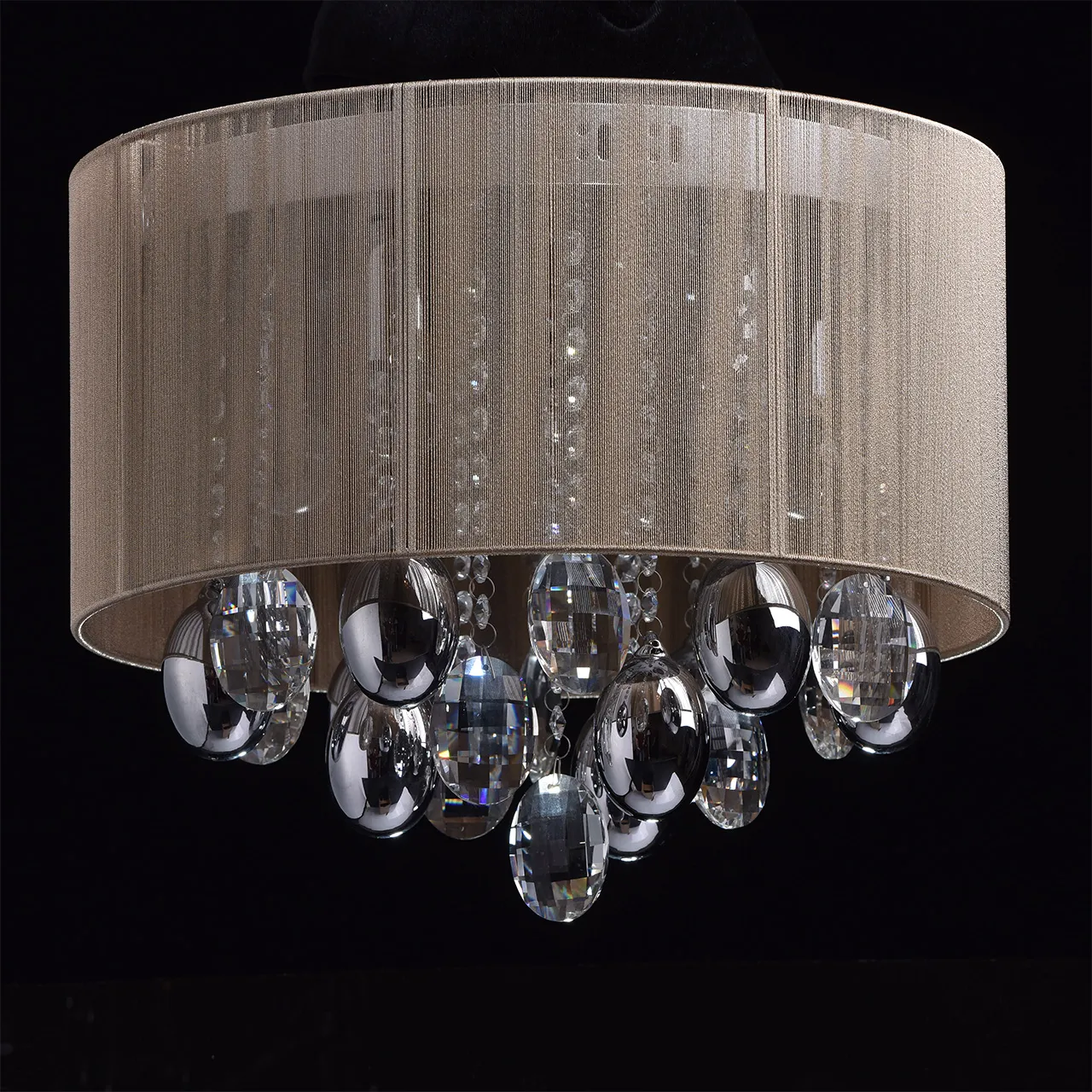 Металлическое основание цвета хрома, абажур, обтянутый тонкими нитями золотого цвета, декоративные э